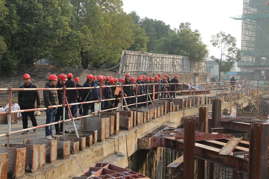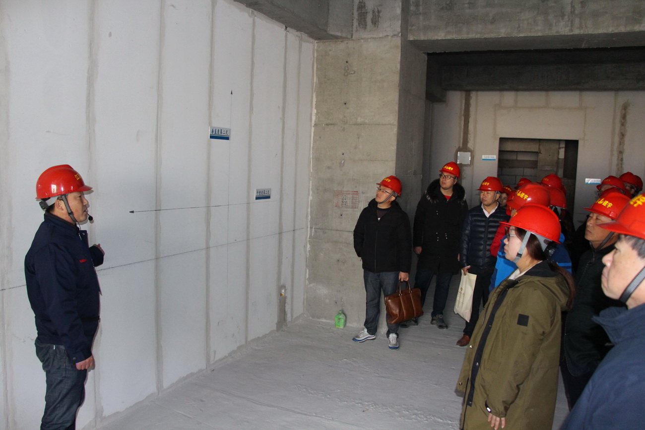 上午,觀摩團一行首先來到了弘陽項目施工現場進行觀摩,聽取了南京公司周月波副經理關于弘陽項目概況的簡要介紹,隨后全體人員分成三組,在項目現場管理人員的帶領下深入施工場地進行了細致地學習與了解,重點觀摩了單體地上建筑面積達6萬平方的1號樓,觀看了1號樓西側一層頂板懸挑長度達到5.6m的懸挑梁、6-13層錯層位置內側搭設的高度達到了31.2m高支模滿堂腳手架、7層輕質隔墻ALC板內隔墻安裝施工樣板、采用了SMW工法樁深基坑支護體系和型鋼混凝土支撐體系等重難點部位及制作精致的施工樣板區(qū)。