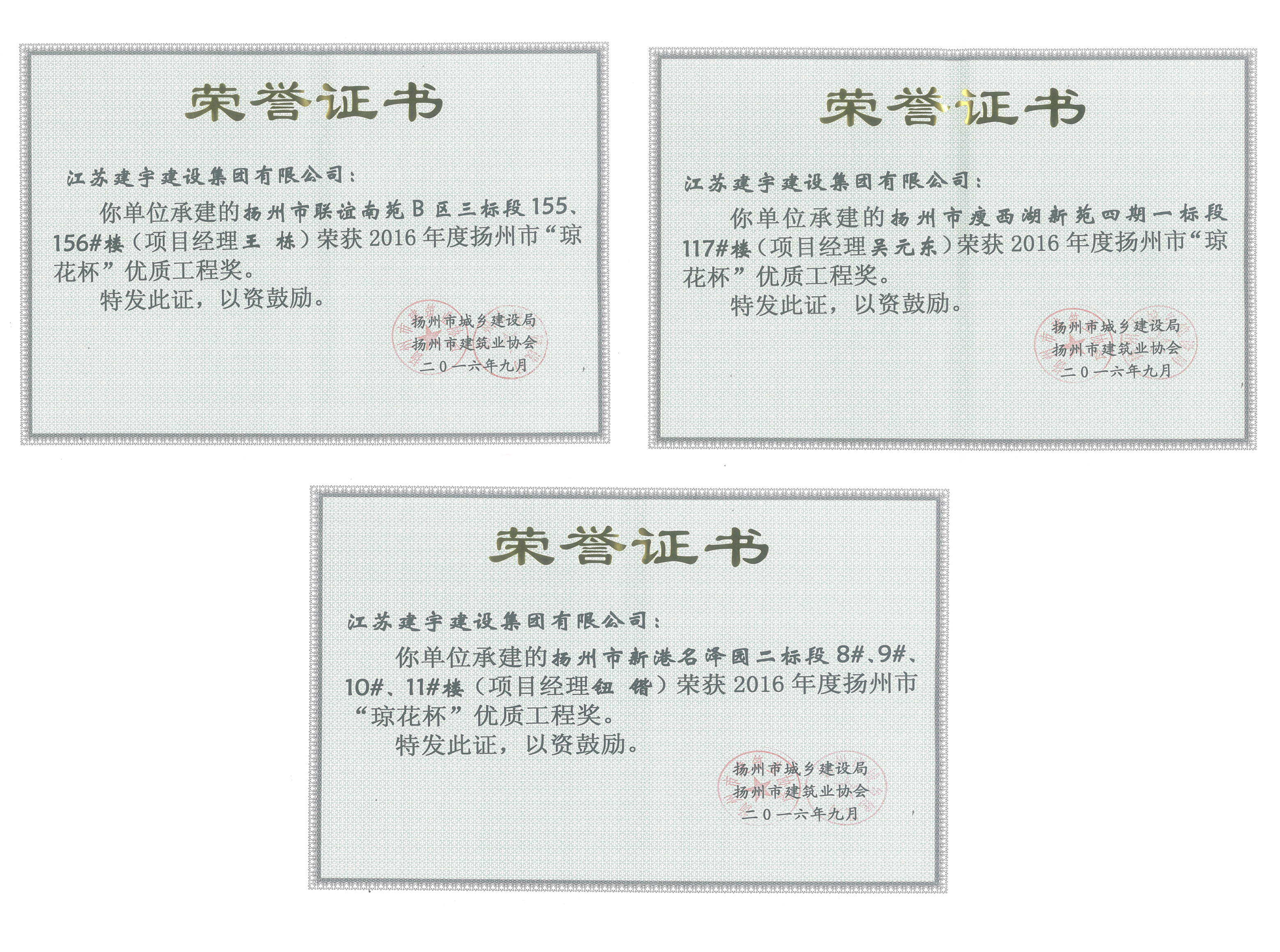 近日,從揚(yáng)州市城鄉(xiāng)建設(shè)局、揚(yáng)州市建筑行業(yè)協(xié)會(huì)傳來喜訊,我集團(tuán)揚(yáng)州分公司承建的“揚(yáng)州市聯(lián)誼南苑B區(qū)三標(biāo)段155、156#樓”、“揚(yáng)州市瘦西湖新苑四期一標(biāo)段117#樓”、“揚(yáng)州市新港名澤園二標(biāo)段8#、9#、10#、11#樓”共三個(gè)項(xiàng)目被表彰為2016年度揚(yáng)州市“瓊花杯”優(yōu)質(zhì)工程獎(jiǎng)。