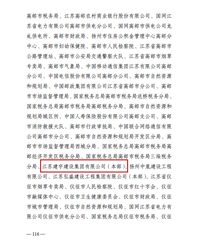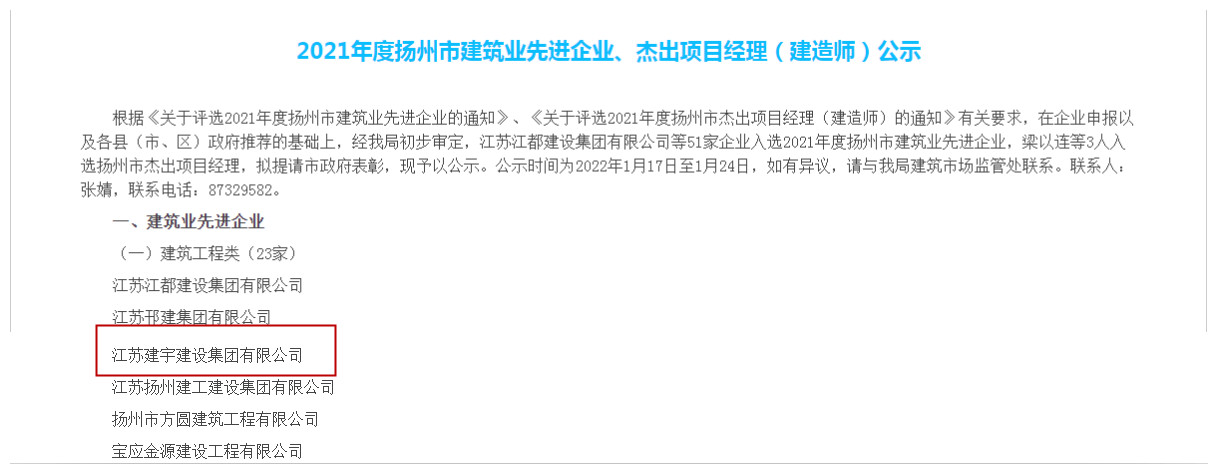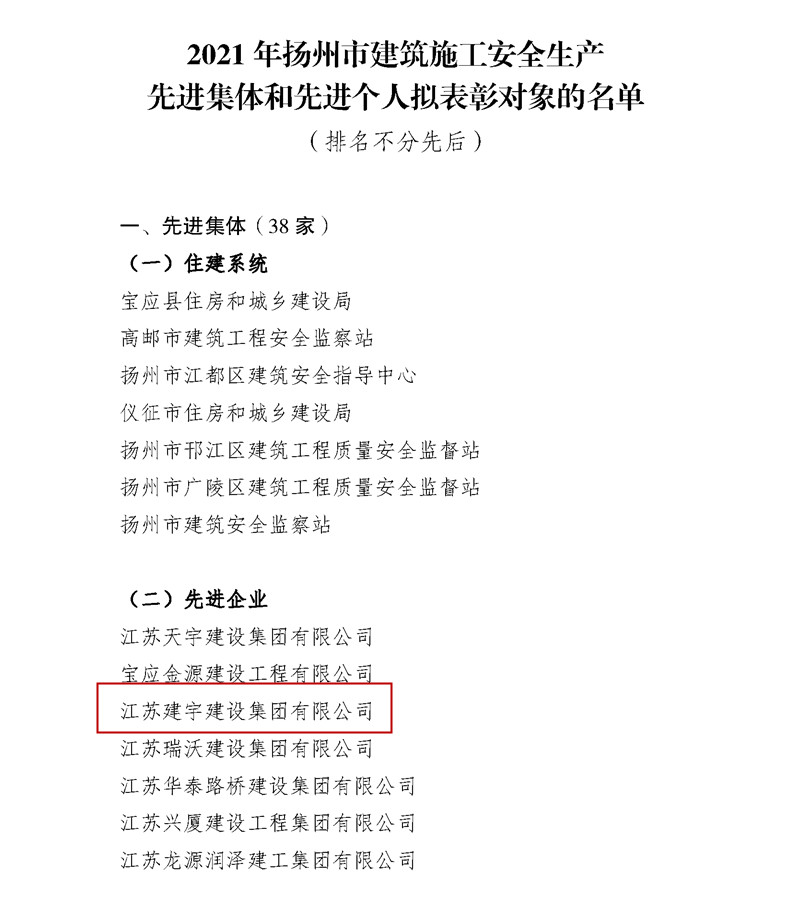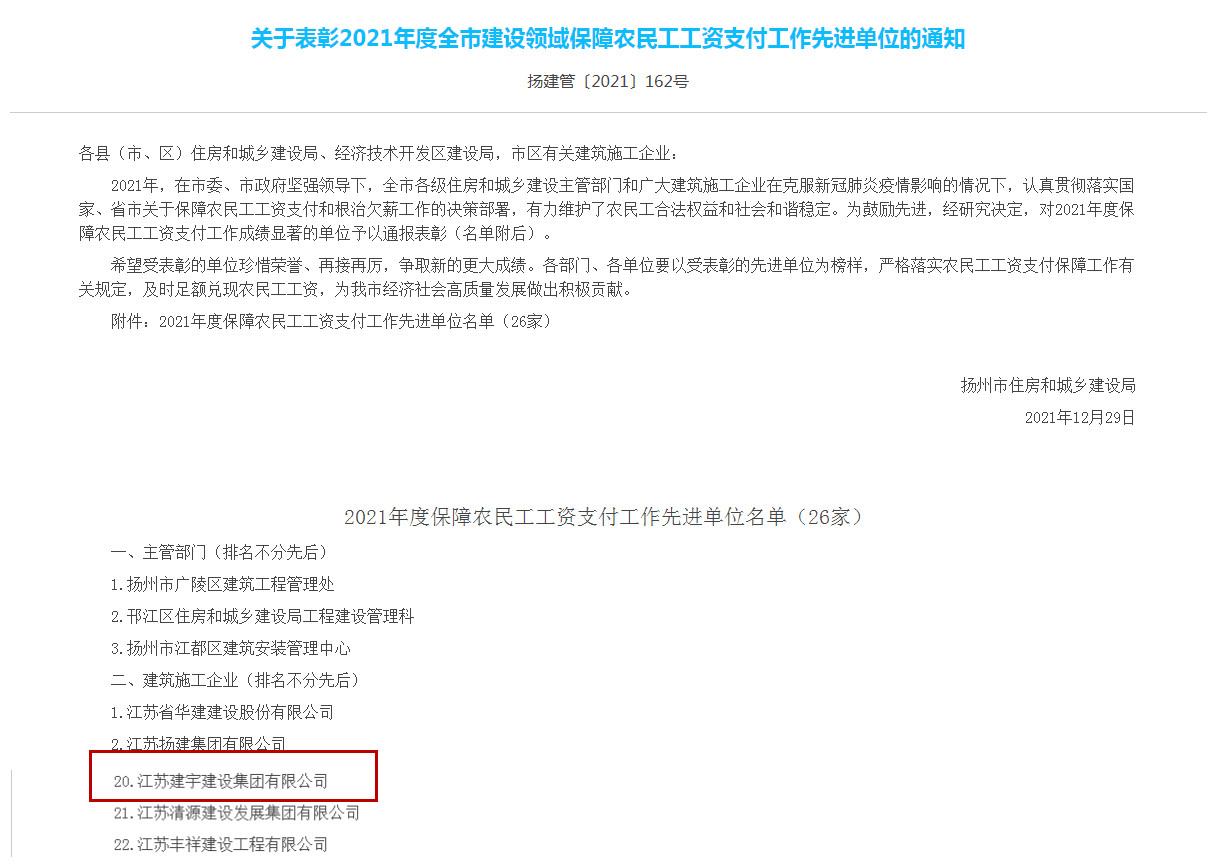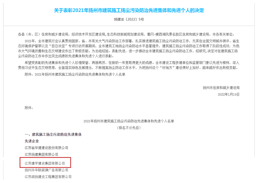 近日,集團被揚州市人民政府評為2021年度揚州市建筑業(yè)先進企業(yè),這是集團第十一次獲此殊榮。同時集團被揚州市住房和城鄉(xiāng)建設局評為2021年度揚州市建筑施工安全生產先進集體、2021年度揚州市揚塵管理先進單位、2021年度揚州市建設領域保障農民工工資支付工作先進單位。此前,集團還被江蘇省精神文明建設指導委員會授予“2019-2021年度江蘇省文明單位”稱號。