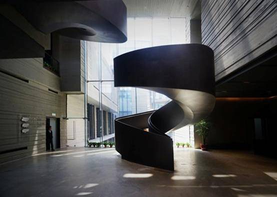 項目采用了清水混凝土施工,木紋清水混凝土元素樸素的風(fēng)格,將建筑與自然融合的更加的完美。接近于360度的雙層螺栓樓梯也是一大亮點(diǎn),由于中間沒有穩(wěn)定支點(diǎn),變形帶有懸挑特性,很難控制其撓度和應(yīng)力。經(jīng)過我單位的二次深化,對傳統(tǒng)樓梯結(jié)構(gòu)進(jìn)行了一系列的創(chuàng)新與優(yōu)化。