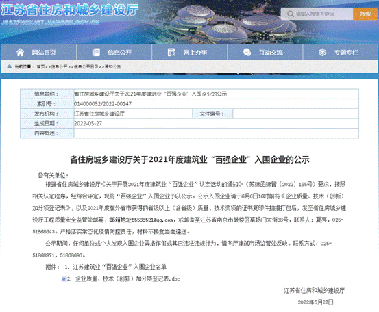 近日,江蘇省住房和城鄉(xiāng)建設(shè)廳公布了2021年度江蘇省建筑業(yè)百強企業(yè)入圍名單。集團憑借自身綜合實力,再次入圍2021年度江蘇省建筑業(yè)“百強企業(yè)”榜單!