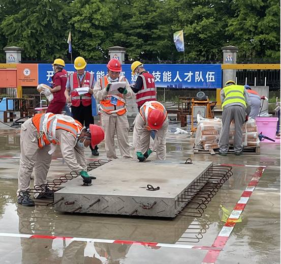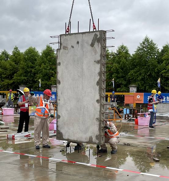 我司代表隊(duì)參加了構(gòu)件裝配組決賽,分為理論和實(shí)操??己藘?nèi)容為預(yù)制剪力墻安裝,過程中對(duì)操作安全、構(gòu)件入場(chǎng)檢查、檢查預(yù)留筋位置、吊裝準(zhǔn)備、吊裝、構(gòu)件安裝質(zhì)量、團(tuán)隊(duì)合作等7個(gè)方面進(jìn)行考核打分。
