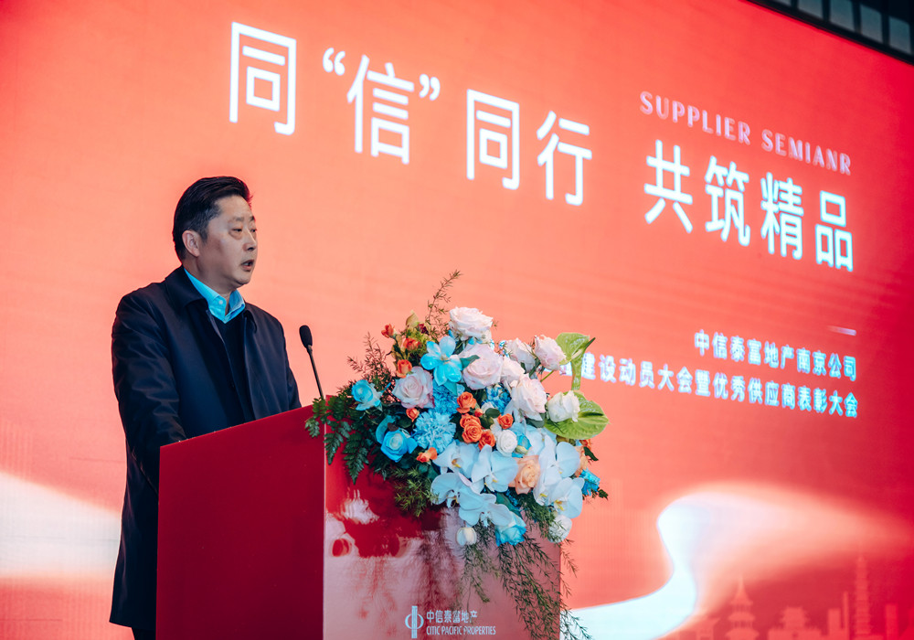 中信泰富地產杜平副總裁為大會致詞,他表示,中信泰富地產南京公司的成功離不開在座合作伙伴的辛勤付出與密切協作,希望有更多像建宇一樣優(yōu)秀的供應商能與中信泰富地產保持長期合作,攜手共贏未來。王學峰副總經理介紹了中信泰富地產概況,解讀了南京公司2023年的奮斗目標。