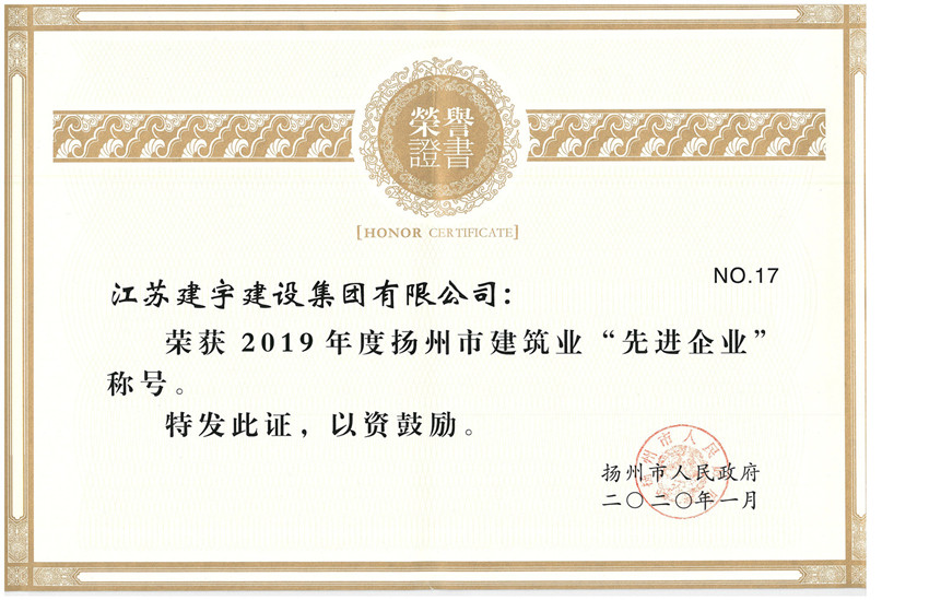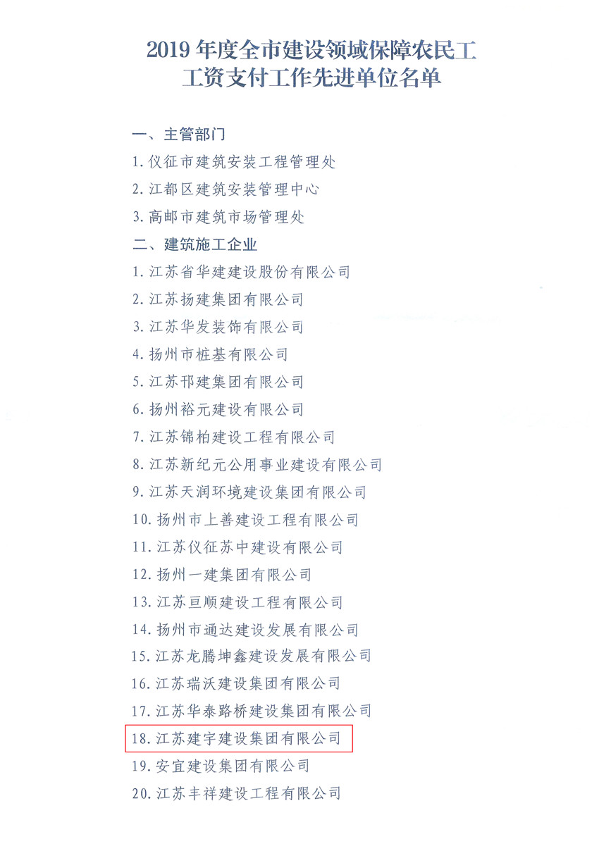 1月15日,從揚(yáng)州市住建局獲悉,集團(tuán)又一次被揚(yáng)州市人民政府評(píng)為揚(yáng)州市建筑業(yè)先進(jìn)企業(yè),這是集團(tuán)第九次獲此殊榮。同時(shí)集團(tuán)再次榮獲了揚(yáng)州市保障農(nóng)民工工資支付工作先進(jìn)單位,王禮亮榮獲優(yōu)秀班組長(zhǎng)。