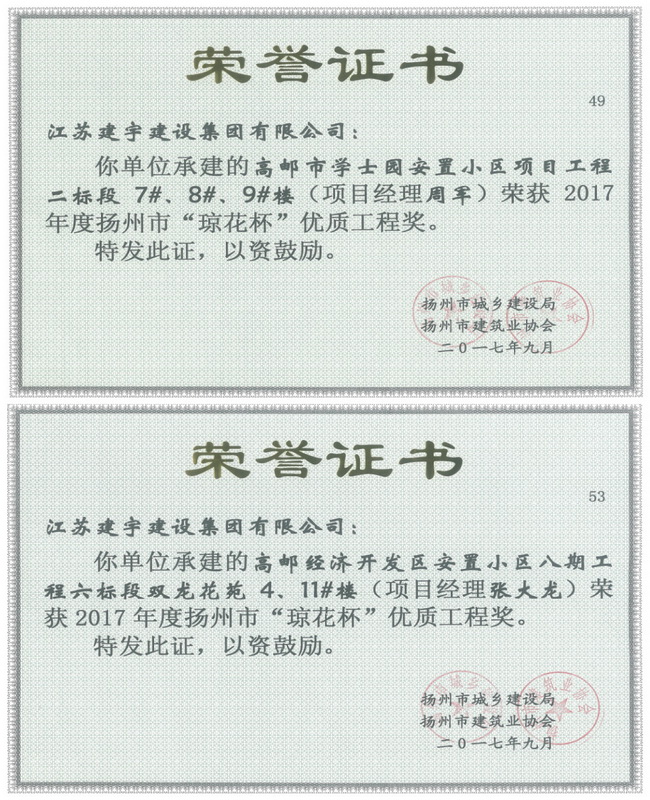 近日,由揚州市城鄉(xiāng)建設(shè)局、揚州市建筑行業(yè)協(xié)會組織的2017年度揚州市“瓊花杯”建筑優(yōu)質(zhì)工程評選結(jié)果日前揭曉,集團高郵分公司承建的“高郵市學士園安置小區(qū)項目工程二標段7#、8#、9#樓”和“高郵市經(jīng)濟開發(fā)區(qū)安置小區(qū)八期雙龍花苑4#、11#樓”兩項工程獲獎。