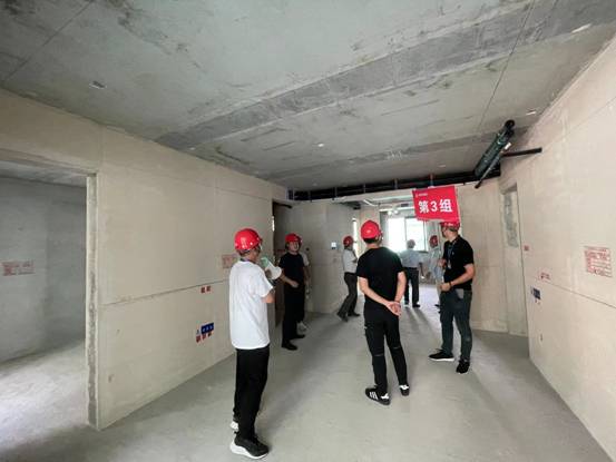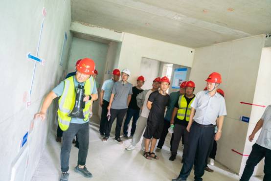 全體觀摩人員同樣分成了三組,在項目現(xiàn)場管理人員的帶領(lǐng)下深入施工場地,重點觀摩了14#樓、22#樓、26#樓粉刷施工工藝樣板、實測實量樣板;預(yù)制剪力墻、預(yù)制疊合板、預(yù)制樓梯、ALC板等施工成型質(zhì)量情況。