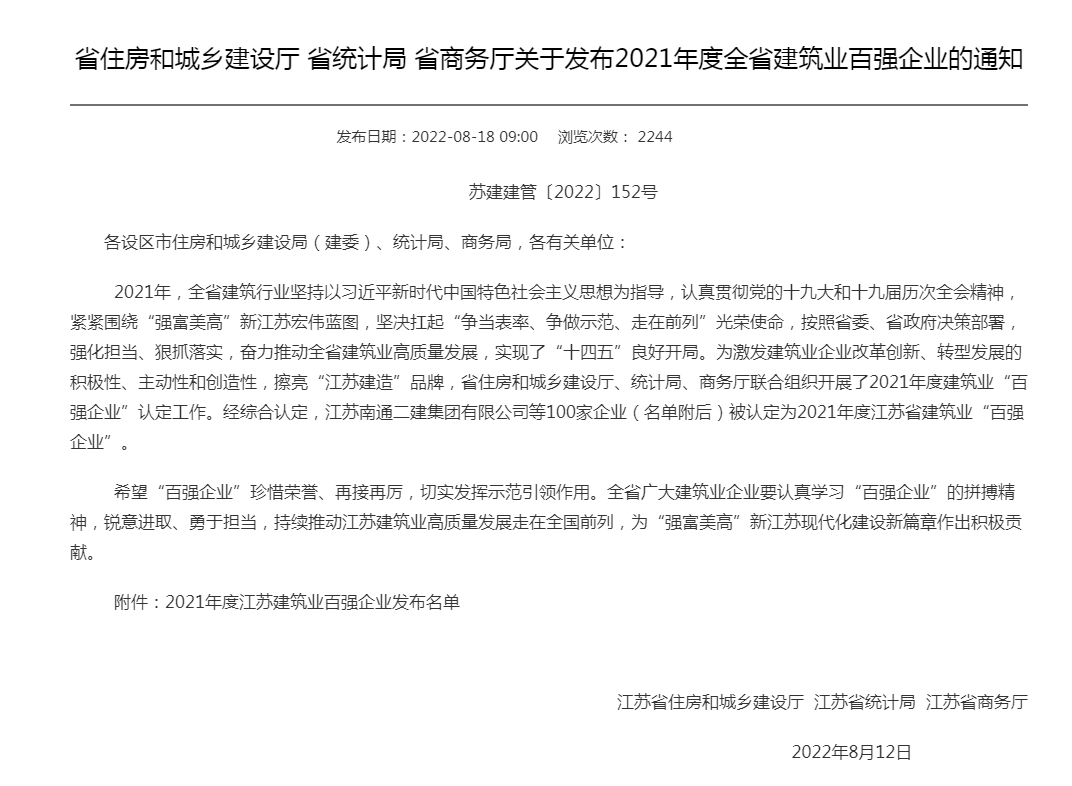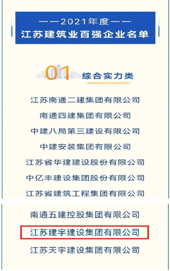 8月18日,2021年度江蘇省建筑業(yè)百?gòu)?qiáng)企業(yè)最終名單公布,集團(tuán)榮獲“2021年度江蘇省建筑業(yè)百?gòu)?qiáng)企業(yè)”榮譽(yù)稱號(hào),充分展現(xiàn)了集團(tuán)綜合實(shí)力和品牌影響力。