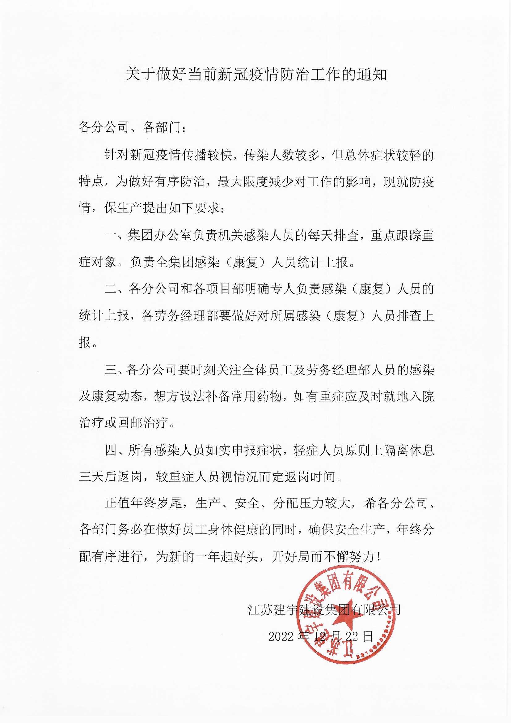 隨著疫情防控新十條的發(fā)布,集團(tuán)針對(duì)疫情防控面臨新形勢(shì)、新階段、新任務(wù),及時(shí)調(diào)整防控策略,及時(shí)發(fā)布了《關(guān)于做好當(dāng)前新冠疫情防控通知》,各分公司迅速貫徹實(shí)施,根據(jù)每天感染情況,積極作為。