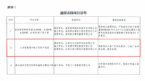 地下空間產(chǎn)業(yè)園項目因安全管理、文明施工到位,文明城市創(chuàng)建落實有力,獲得了南京江北新區(qū)建交局質(zhì)安站的通報表揚。項目部積極響應(yīng)公益廣告布置要求,公益廣告布局合理、整齊美觀受到主管部門領(lǐng)導(dǎo)的一致好評,成為江北新區(qū)建筑工地安全文明建設(shè)的領(lǐng)頭羊。
