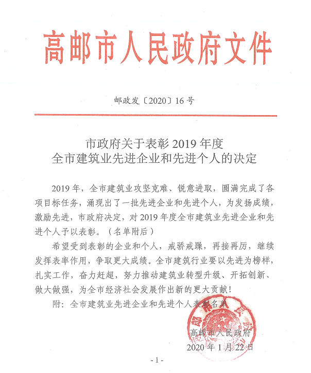 2019年我公司緊緊圍繞既定的戰(zhàn)略目標(biāo),面對(duì)低迷的建筑市場(chǎng),團(tuán)結(jié)奮進(jìn),爭(zhēng)先進(jìn)位,各項(xiàng)經(jīng)濟(jì)指標(biāo)穩(wěn)中有升,在高郵市納稅名列前茅,在揚(yáng)州市納稅也取得了較好的名次。與此同時(shí),在建筑業(yè)日趨嚴(yán)峻的形勢(shì)下,集團(tuán)再次蟬聯(lián)高郵市優(yōu)秀企業(yè),也證明了企業(yè)發(fā)展理念的先導(dǎo)性和準(zhǔn)確性。