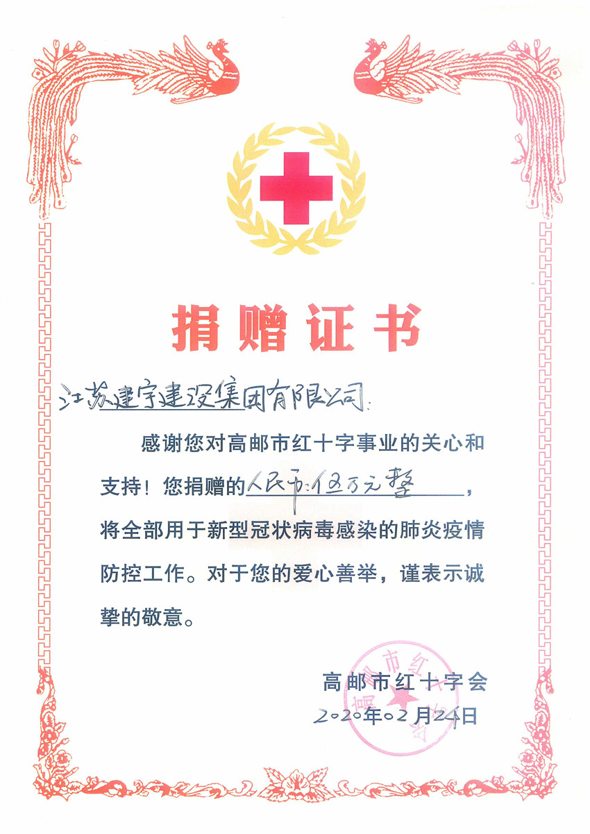 捐贈(zèng)儀式上,集團(tuán)董事長(zhǎng)管民良表示,新冠肺炎疫情牽動(dòng)著國(guó)人的心,建宇集團(tuán)積極參與抗疫,集團(tuán)旗下皇華大酒店堅(jiān)守多日,為市防疫指揮部提供優(yōu)服務(wù);集團(tuán)此前已通過南京市高郵商會(huì)等多途徑奉獻(xiàn)愛心,此次再捐贈(zèng)5萬元用于抗擊新冠肺炎疫情。周鎮(zhèn)長(zhǎng)等領(lǐng)導(dǎo)對(duì)集團(tuán)的善行義舉和愛心捐贈(zèng)表示真誠(chéng)的感謝,并現(xiàn)場(chǎng)頒發(fā)愛心證書,稱贊集團(tuán)此舉是作為市、鎮(zhèn)重點(diǎn)建筑企業(yè)勇于承擔(dān)社會(huì)責(zé)任的體現(xiàn)。